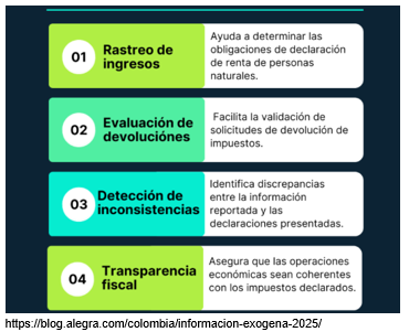 La información exógena son los datos que las entidades obligadas debe reportar anualmente a la Dirección de Impuestos y Aduanas Nacionales Dian sobre las transacciones realizadas con terceros, parte de la información que se reporta son los pagos o abono en cuenta (compras), retenciones practicadas, ingresos, IVA generado e IVA descontable entre otros.